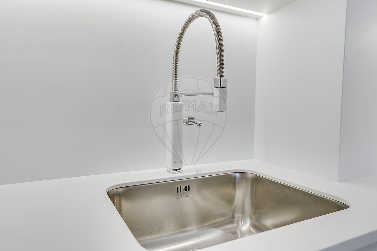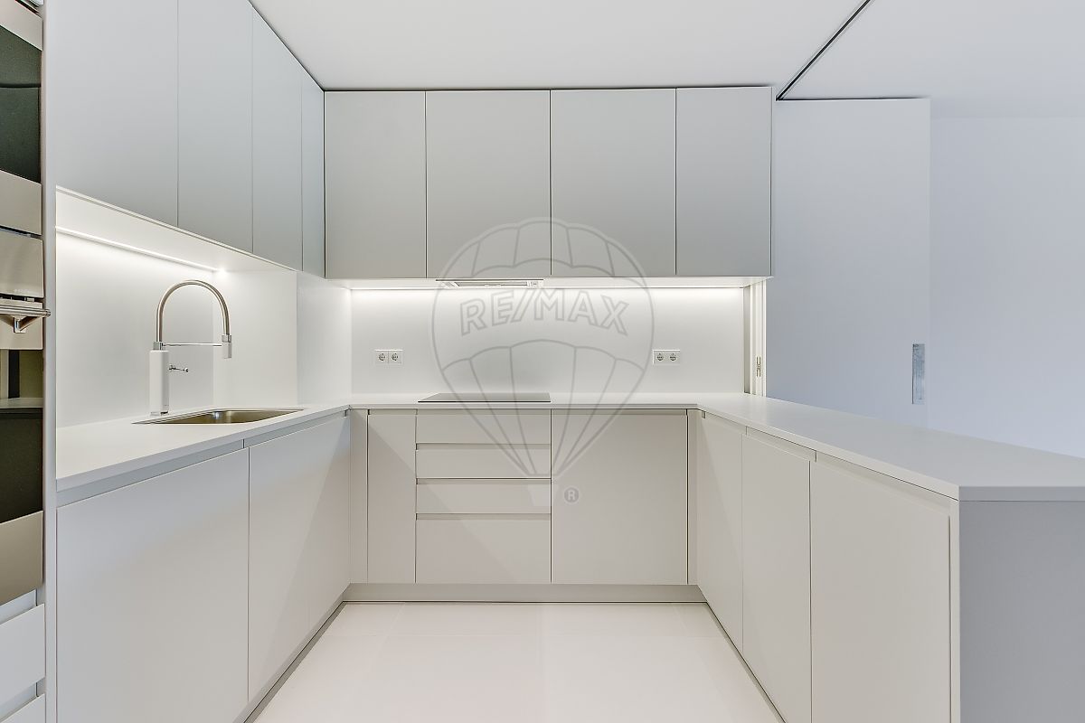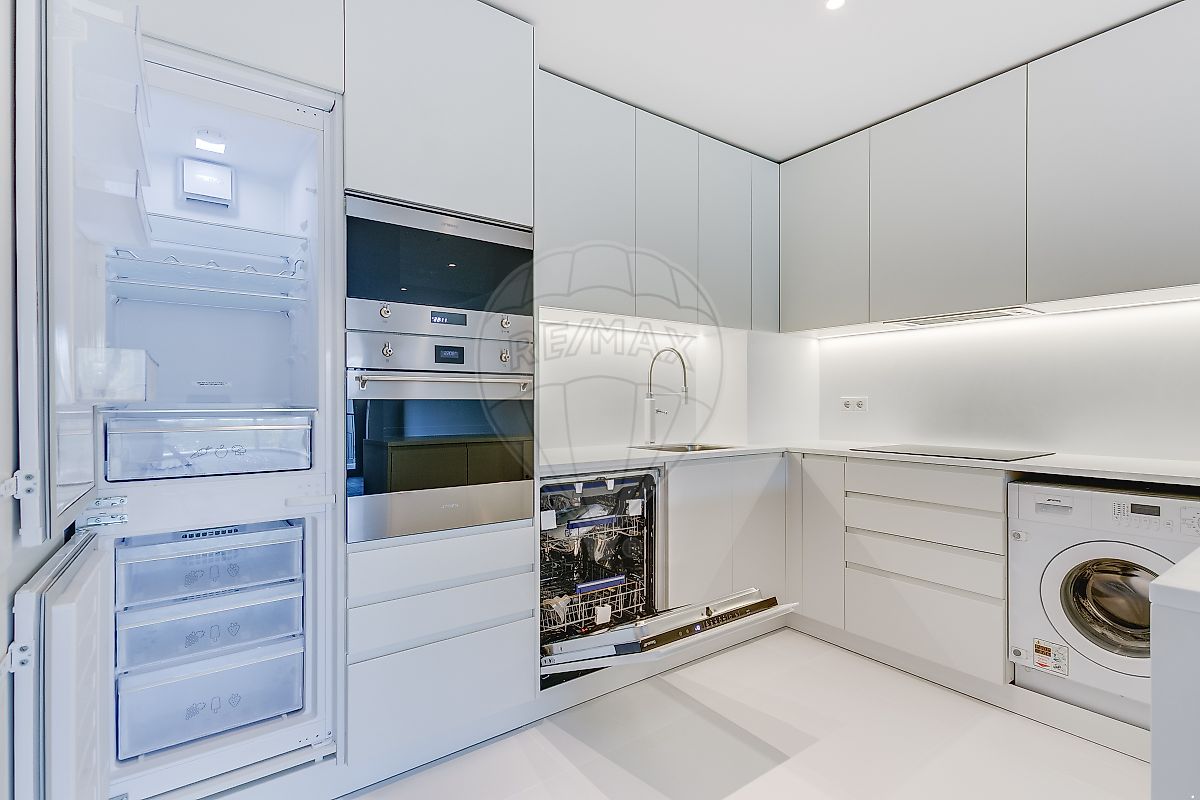 Cozinha semi open-space, com sistema de fecho moderno, permitindo optar entre integração ou separação total do espaço; equipada com eletrodomésticos Smeg de última geração